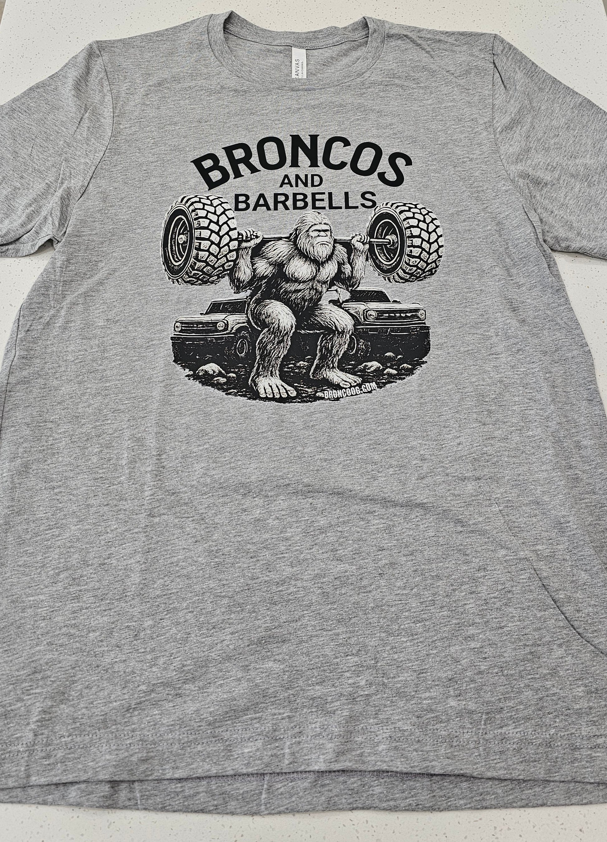 Unleash the beast within — the Broncos and Barbells tee combines off-road grit and gym grind in one legendary design. Featuring a jacked Sasquatch hammering a heavy back squat with off-road tires for plates, this shirt is built for those who live wild, lift heavy, and never back down.