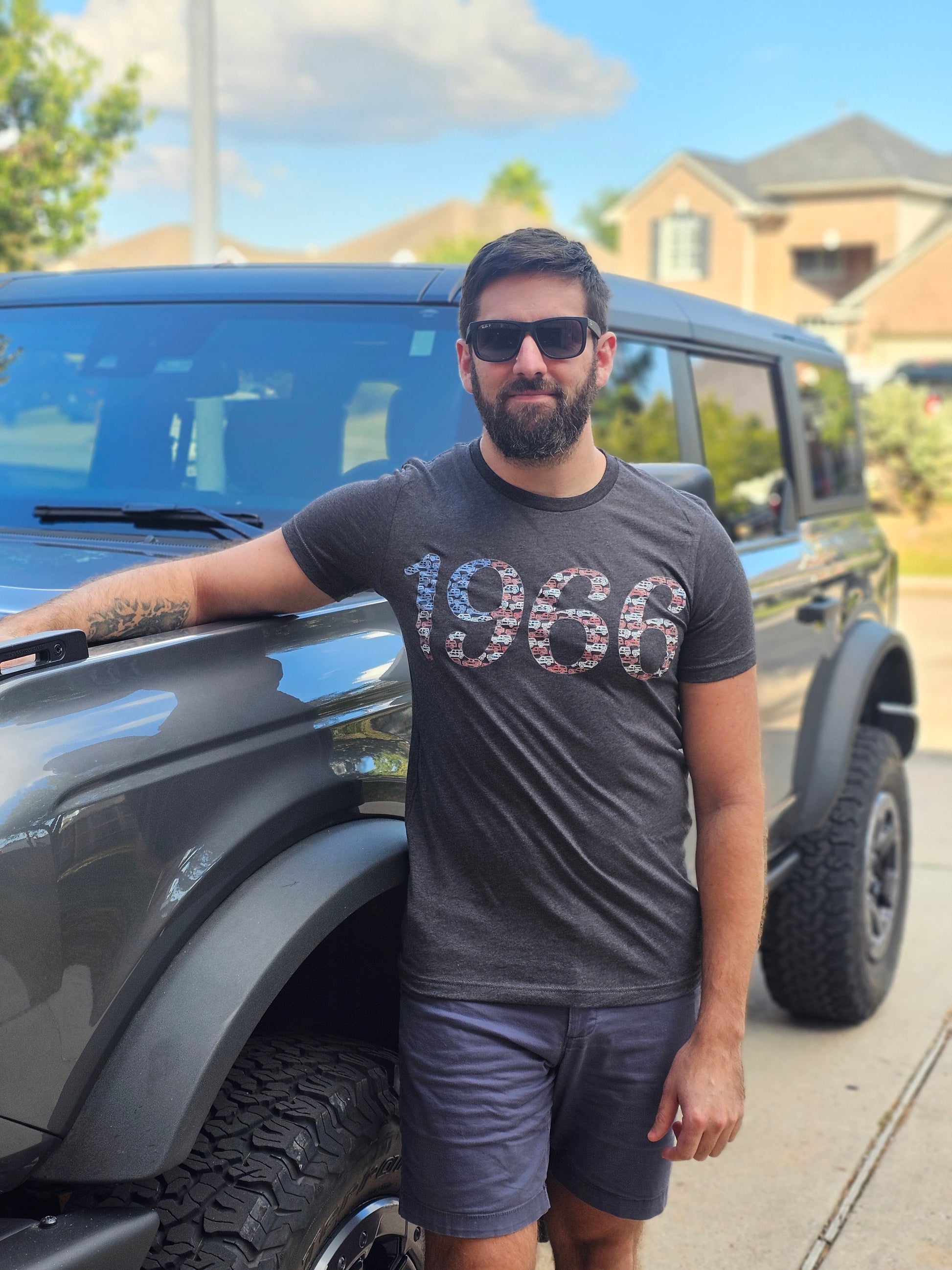 Celebrate over 50 years of Bronco history—order your 1966 Ford Bronco Generations American Flag T-shirt today from BroncoOG.com!